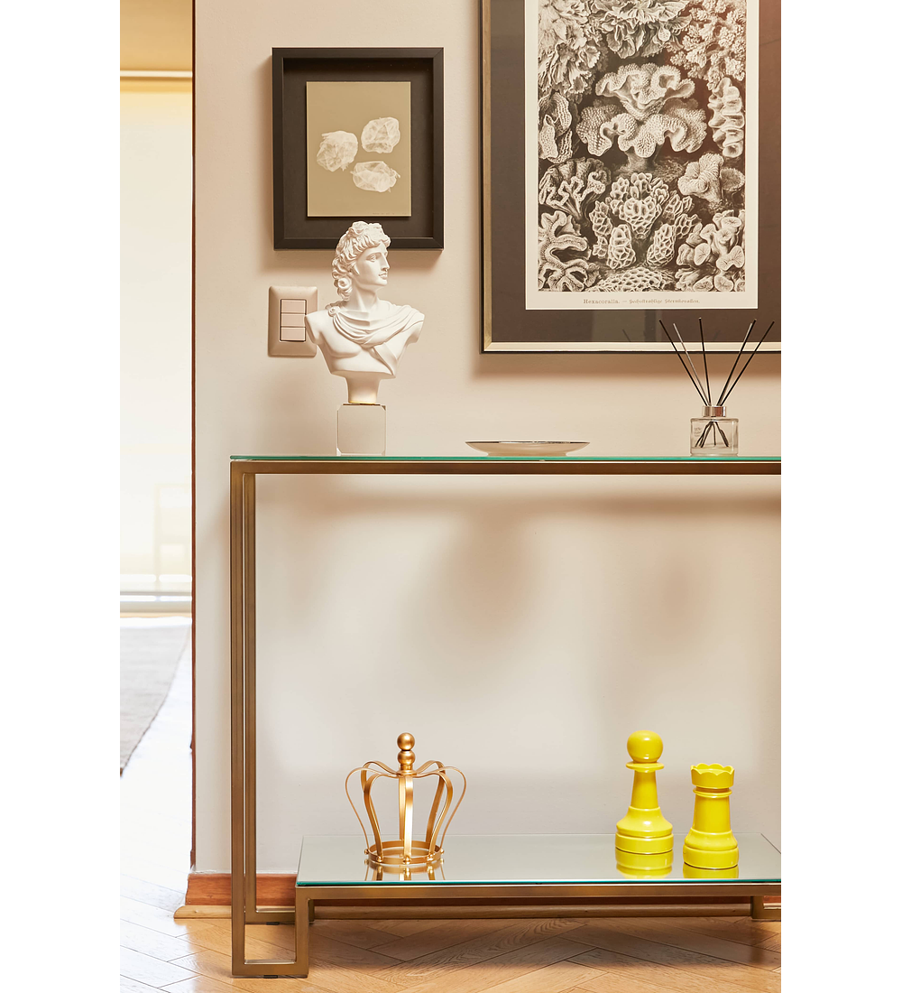Materiales: cubierta superior en cristal 6mm e inferior en espejo, estructura electro pintada disponible en dorado, plateado y negro, perfil 20x20.